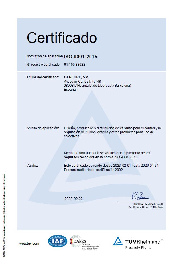 GENEBRE tiene implantado un sistema de gestión de calidad estricto para el diseño y la producción de válvulas de control y regulación de fluidos y la distribución de grifos para uso doméstico y para colectividades.