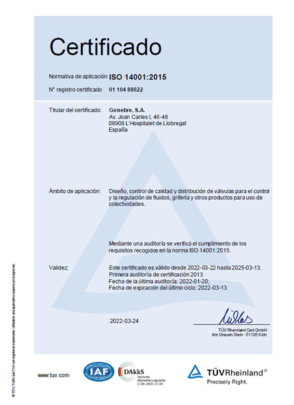 Desde el año 2000, GENEBRE aplica el Modelo Europeo de Excelencia Empresarial (EFQM), basado en la mejora continua y la excelencia en la gestión, que fue reconocido en 2003 con los Premios a la Calidad de la Generalitat de Catalunya. Este compromiso con la calidad se refuerza con la certificación de nuestro Sistema de Gestión Ambiental conforme a la norma UNE-EN ISO 14001:2015, otorgada por TÜV Rheinland, y nos permite ofrecer productos fiables, sostenibles y con un alto valor añadido.